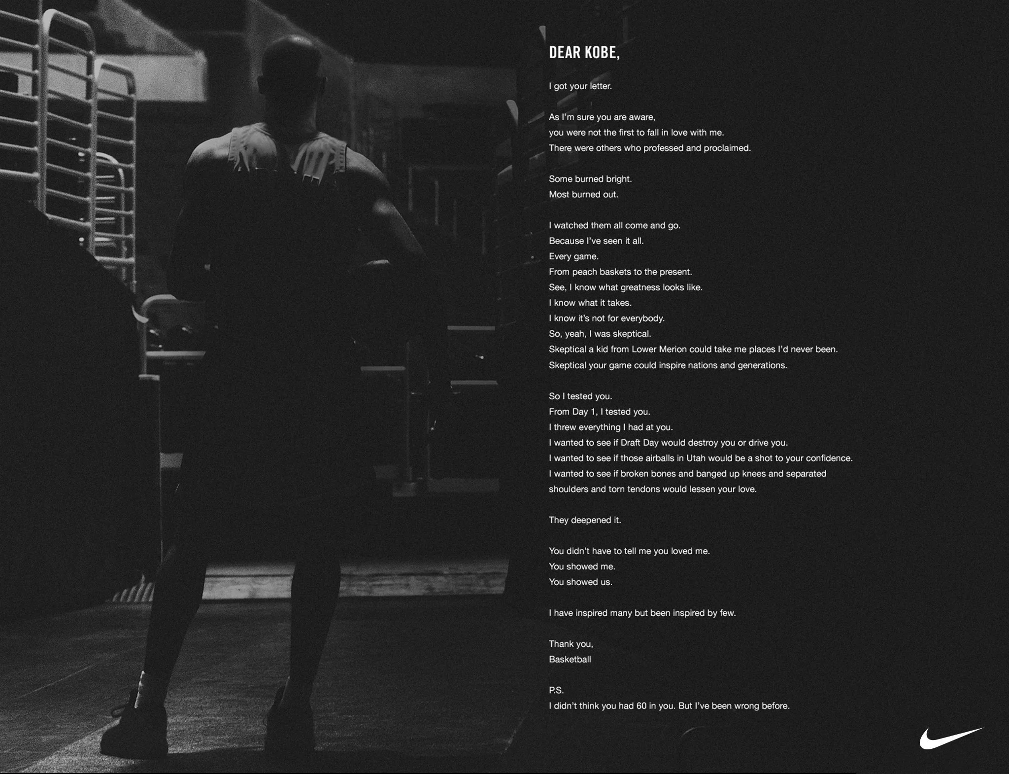 With his final season tipping off and the Kobe XI launching, I concepted and ghostwrote an 11-part journal for Nike.com of lessons Kobe learned throughout his legendary career. Each lesson coincided with a Kobe XI drop and on his farewell tour, Kobe would inscribe the lesson titles, and a personal note, on Kobe XIs and gift them to up & coming players who embodied the Mamba Mentality. And when Kobe wrote his iconic, “Dear Basketball” Players’ Tribune piece, I came up with a reply from (Nike) Basketball. Throughout the project, I tried to honor Kobe’s legacy and the work means even more to me now.